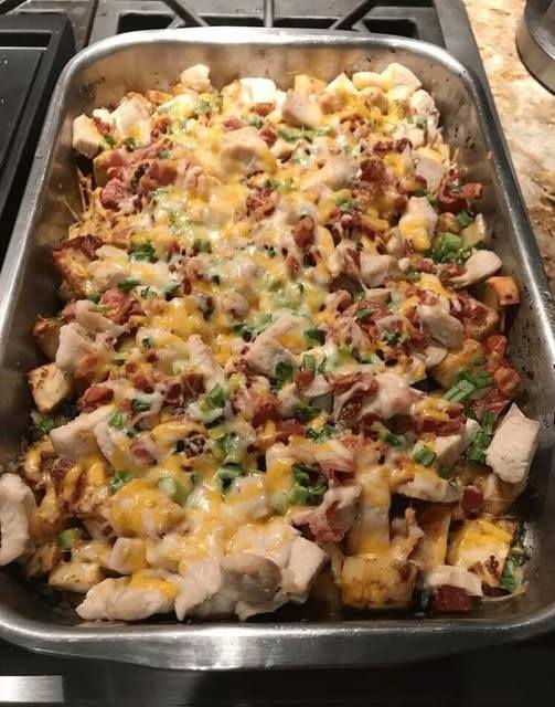 The cheese layer is essential for the “loaded” effect. A mixture of shredded cheddar and mozzarella is often used, melting into the potatoes and chicken to create gooey, creamy pockets of flavor. Cheese adds both richness and depth, binding the layers together while providing the familiar indulgent taste that people love in a baked potato. For an extra touch, a sprinkle of cream cheese or sour cream can be added to enhance creaminess and flavor, making each bite even more satisfying.