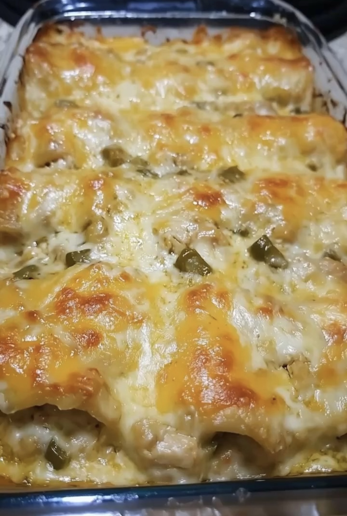 This dish stands out because it uses simple ingredients that blend together effortlessly. The tortillas absorb the creamy sauce and become soft without falling apart. The chicken brings protein and flavor, while the cheese adds richness and a perfect golden crust on top. The green chilies or peppers add mild heat and brightness, balancing the richness of the sauce. Everything bakes into one comforting casserole that is easy to cut, serve and customize.