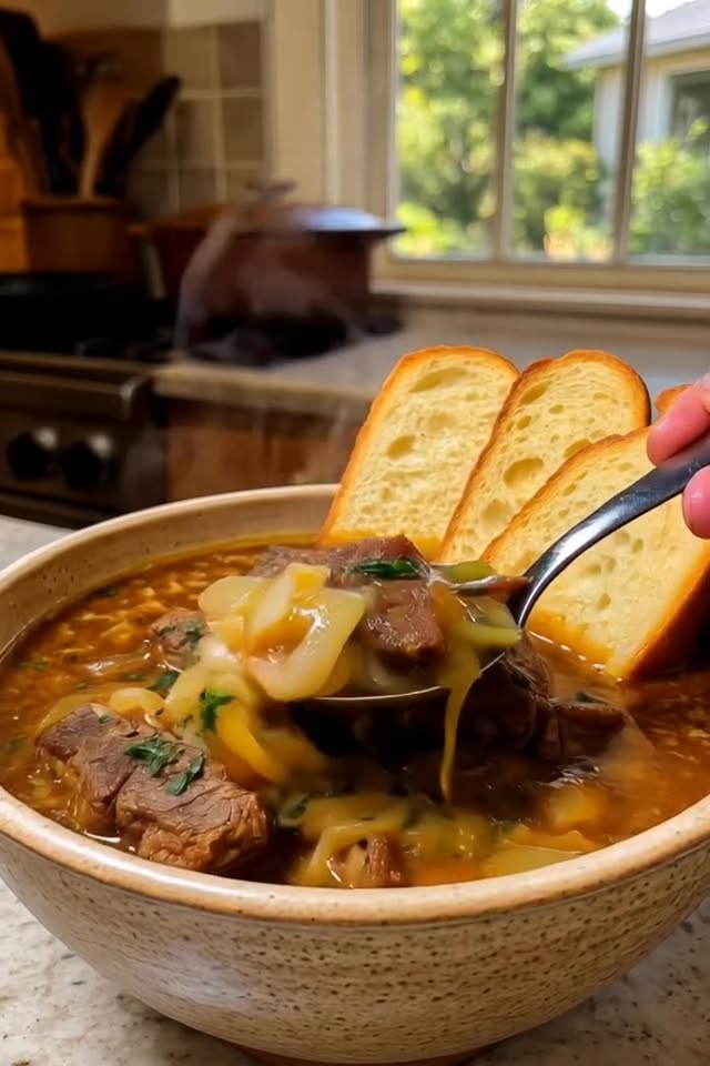Ladle the hot soup into bowls and top each serving with one or two cheese-covered toasts. As the bread absorbs the broth, it softens while still offering texture. The melted cheese stretches with each spoonful, creating layers of flavor—sweet onions, savory beef, and rich broth all in one bite.