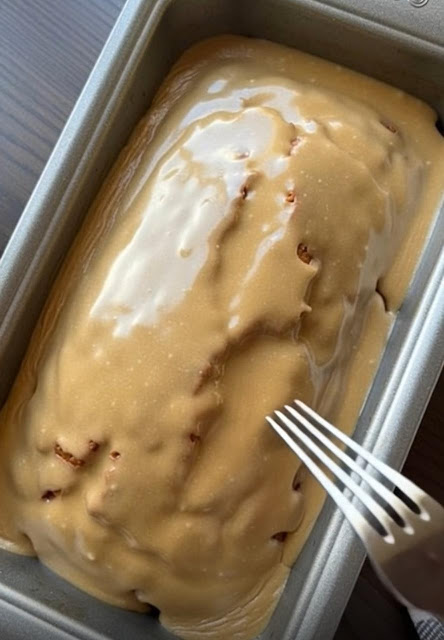 Pour the remaining batter over the caramel layer and smooth it out. Add another drizzle of caramel on top if you like. A few swirls on the surface give the bread a beautiful marbled appearance once baked.