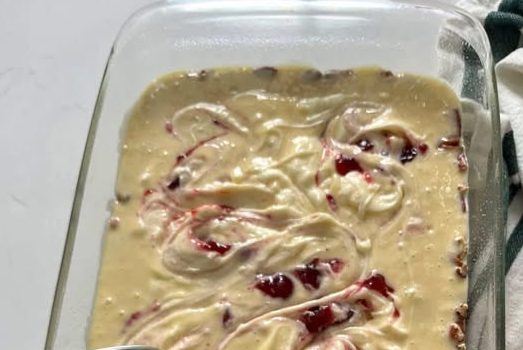 The cream cheese layer is the heart of the dessert. Combine softened cream cheese with sugar, egg, and vanilla until smooth. This mixture should be creamy and easy to spread, allowing it to glide over the warm crust. As it bakes, it firms up slightly but still remains soft and creamy in the center. This layer works well with the tart cranberries above it because it mellows their flavor and adds a luxurious smoothness.