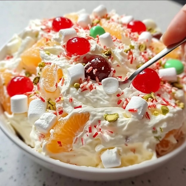 In conclusion, Christmas Fluff is a timeless holiday classic that deserves a place on every festive table. With its simple preparation, vibrant appearance, and irresistible flavor, it delivers comfort and celebration in every bite. It is proof that sometimes the most beloved holiday dishes are the ones that are easiest to make. Creamy, fruity, and full of holiday spirit, this dessert brings people together and creates memories that last long after the season ends.