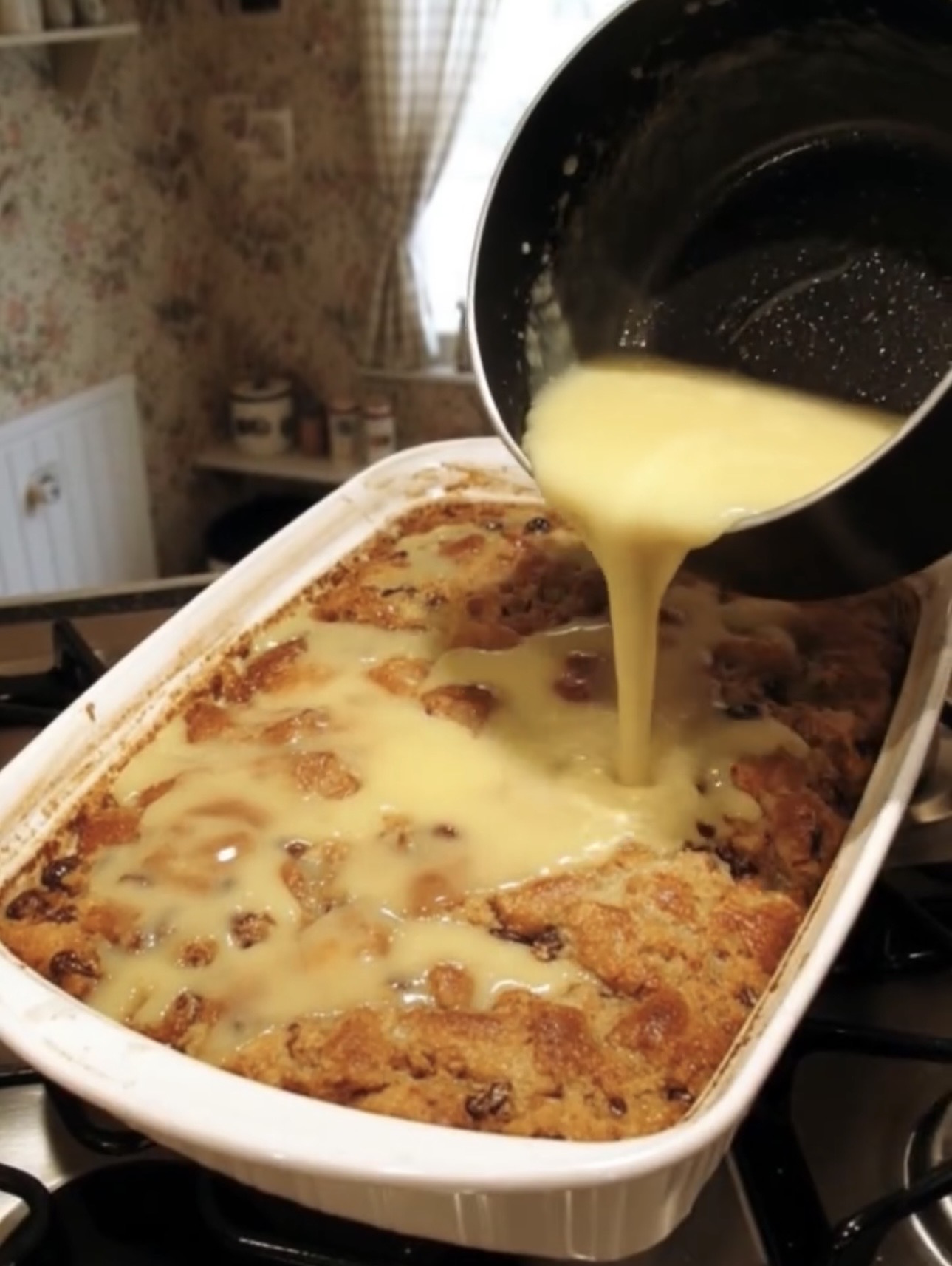 This dessert is best served warm, straight from the oven or gently reheated. Spoon warm custard sauce generously over each portion for maximum indulgence. It pairs beautifully with a cup of coffee, tea, or even a scoop of vanilla ice cream for extra contrast.