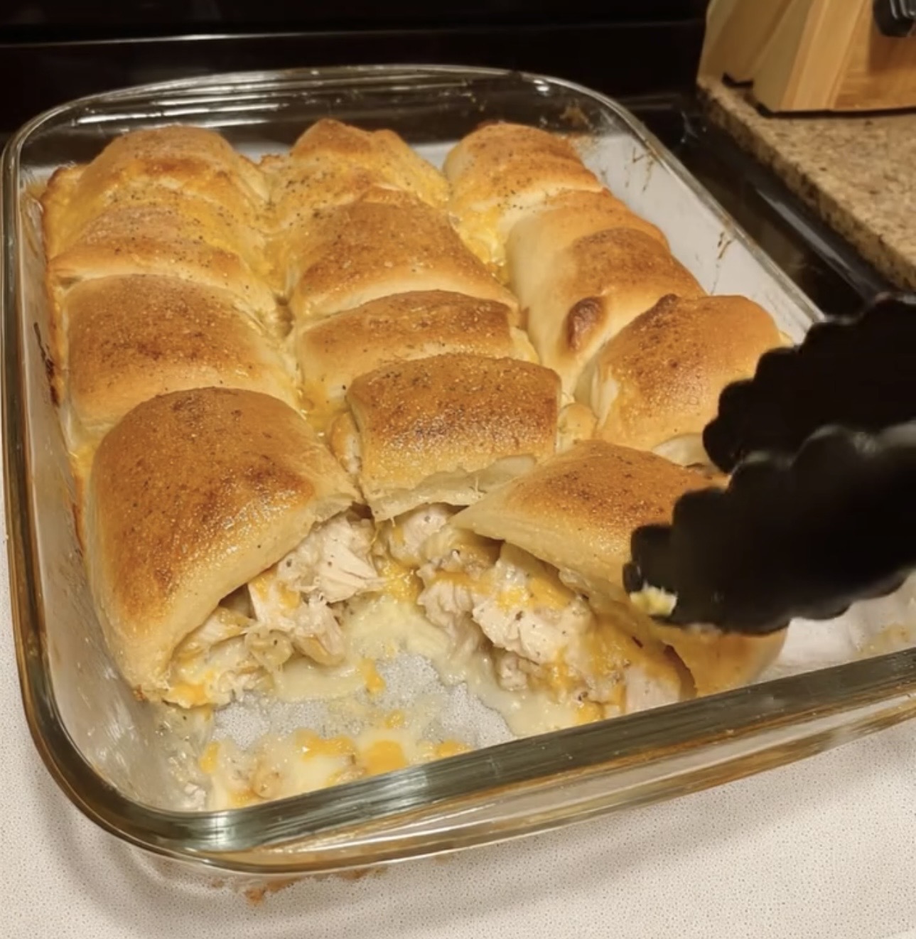 Keep the rolls connected and slice them horizontally as a single slab. Place the bottom half into a greased baking dish. Spread the chicken and cheese mixture evenly across the rolls, making sure to reach the edges.
