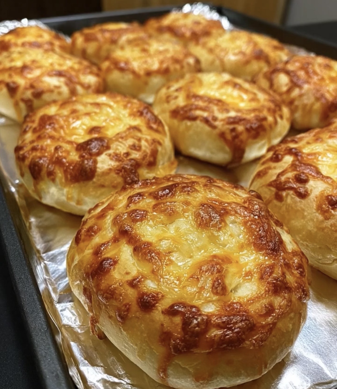 The rolls are baked until golden brown and fully risen. The kitchen fills with the comforting aroma of fresh bread and melted cheese, signaling that they are nearly ready.
