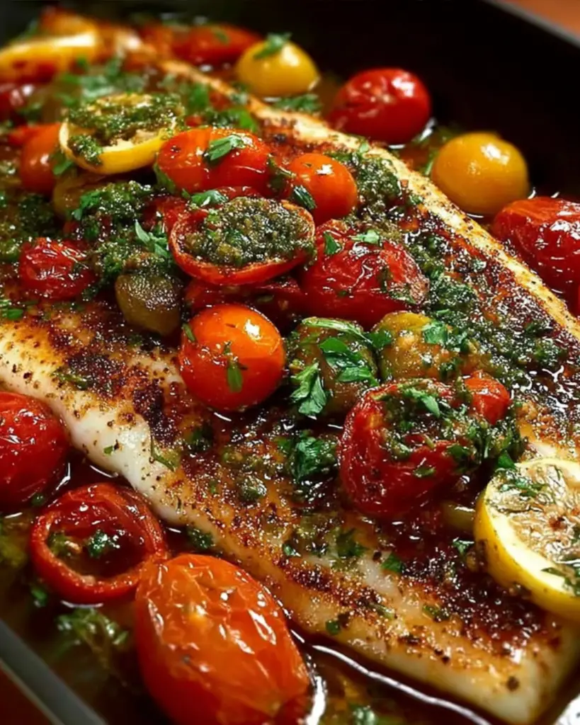 Spoon the tomato and olive mixture evenly over the fish fillets, making sure the vegetables surround and lightly cover the fish. This helps keep the fish moist while baking.