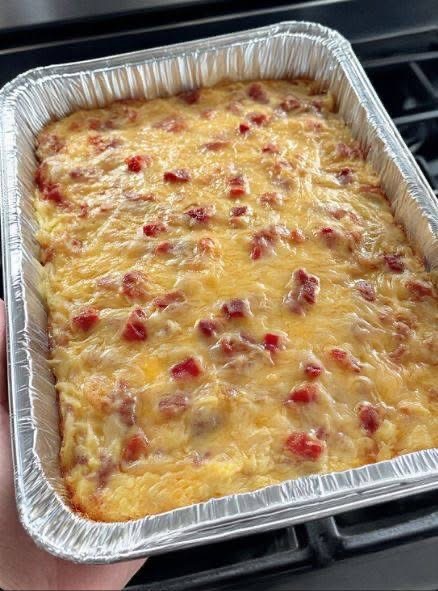 Once the casserole sets and reaches a golden shade, remove it from the oven and let it cool just enough to slice. Serve warm in generous scoops. Pair with fruit, eggs, toast, or just a cup of coffee — this dish can stand on its own.
