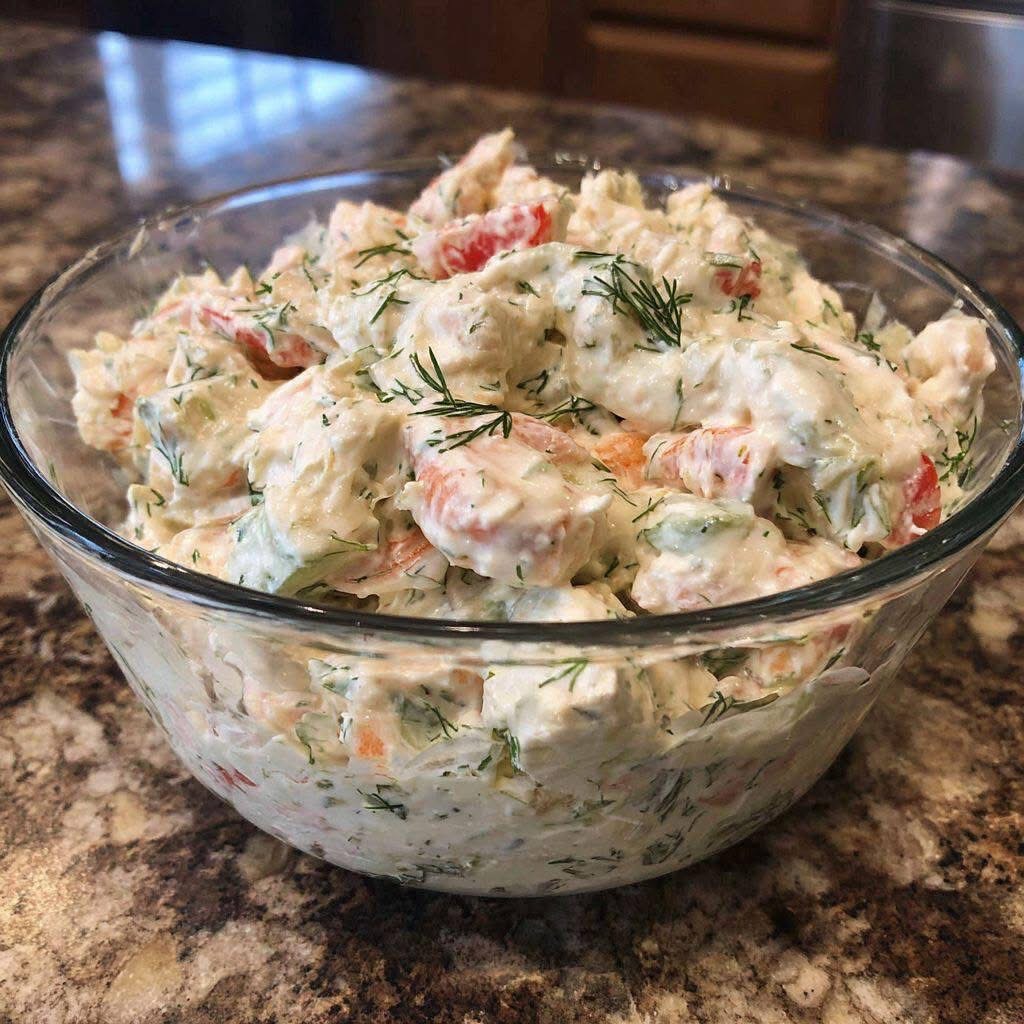 For presentation, garnish with extra fresh dill or a sprinkle of black pepper just before serving. Serve it in a clear bowl to highlight the creamy texture and colorful vegetables.