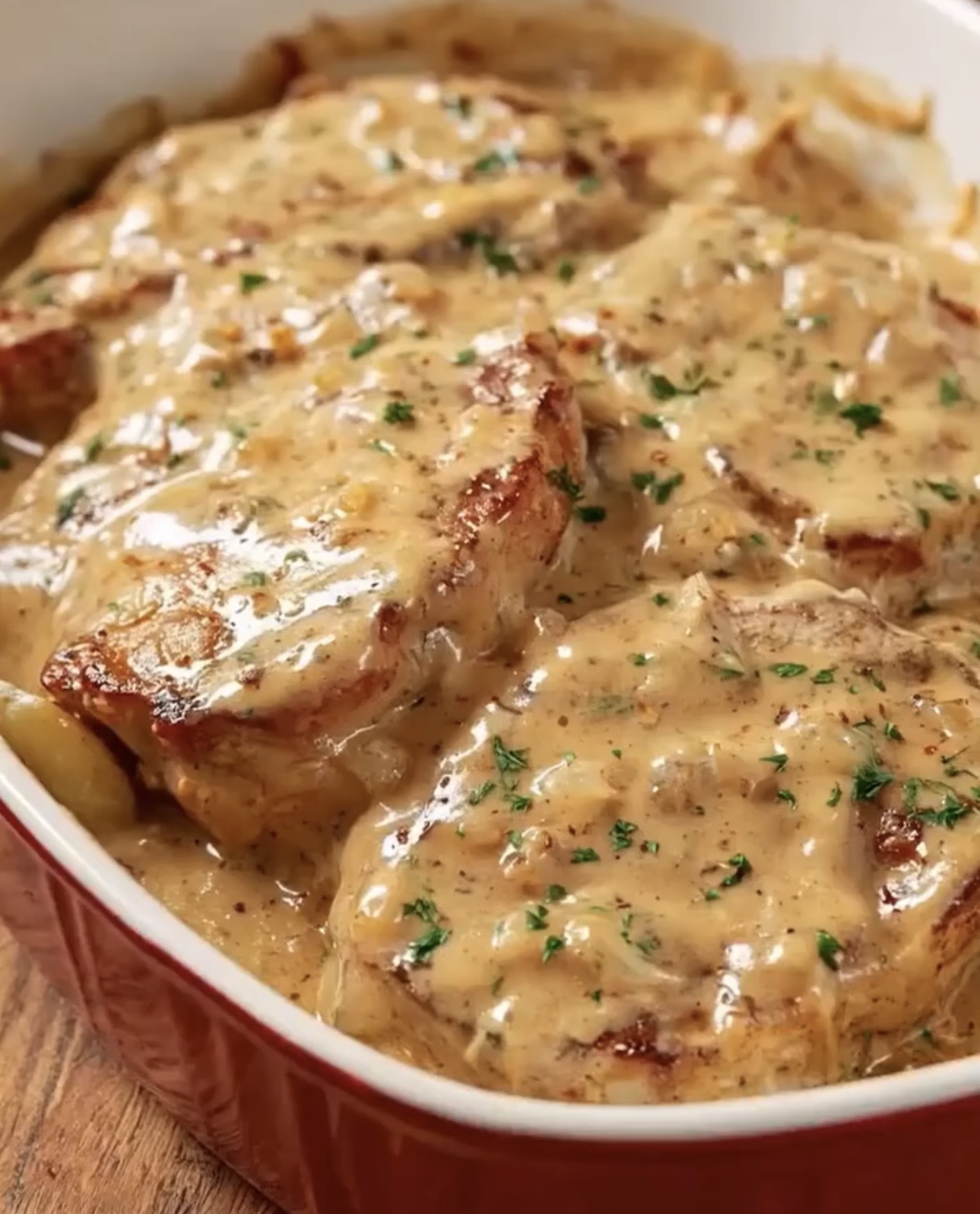 This recipe delivers maximum flavor with minimal effort. Searing the pork chops adds depth, while baking them in creamy gravy ensures tenderness. The onions and garlic create a savory base, and the cream brings everything together into a smooth, comforting sauce.
