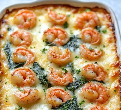 Baked shrimp and spinach gratin is creamy, elegant, and surprisingly easy to prepare. Juicy shrimp, tender spinach, and a rich, cheesy sauce come together under a golden topping, making this dish perfect for both weeknight dinners and special occasions.