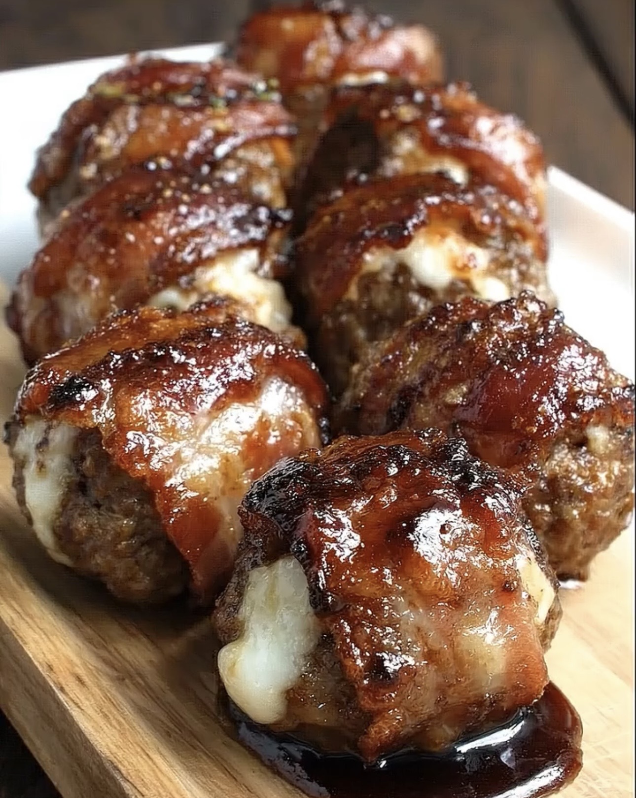 These stuffed meatballs are full of texture and flavor. The beef stays juicy, the cheese melts into a creamy center, the bacon turns crispy, and the barbecue sauce creates a glossy finish that ties everything together.