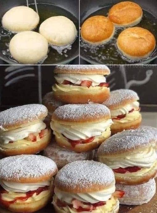If you’re craving something soft, sweet, and irresistible, these fluffy fried donuts with cream filling are exactly what you need. Golden on the outside, light and airy on the inside, and filled with smooth cream and fresh strawberries — this recipe is perfect for breakfast, dessert, or even a special treat for guests.