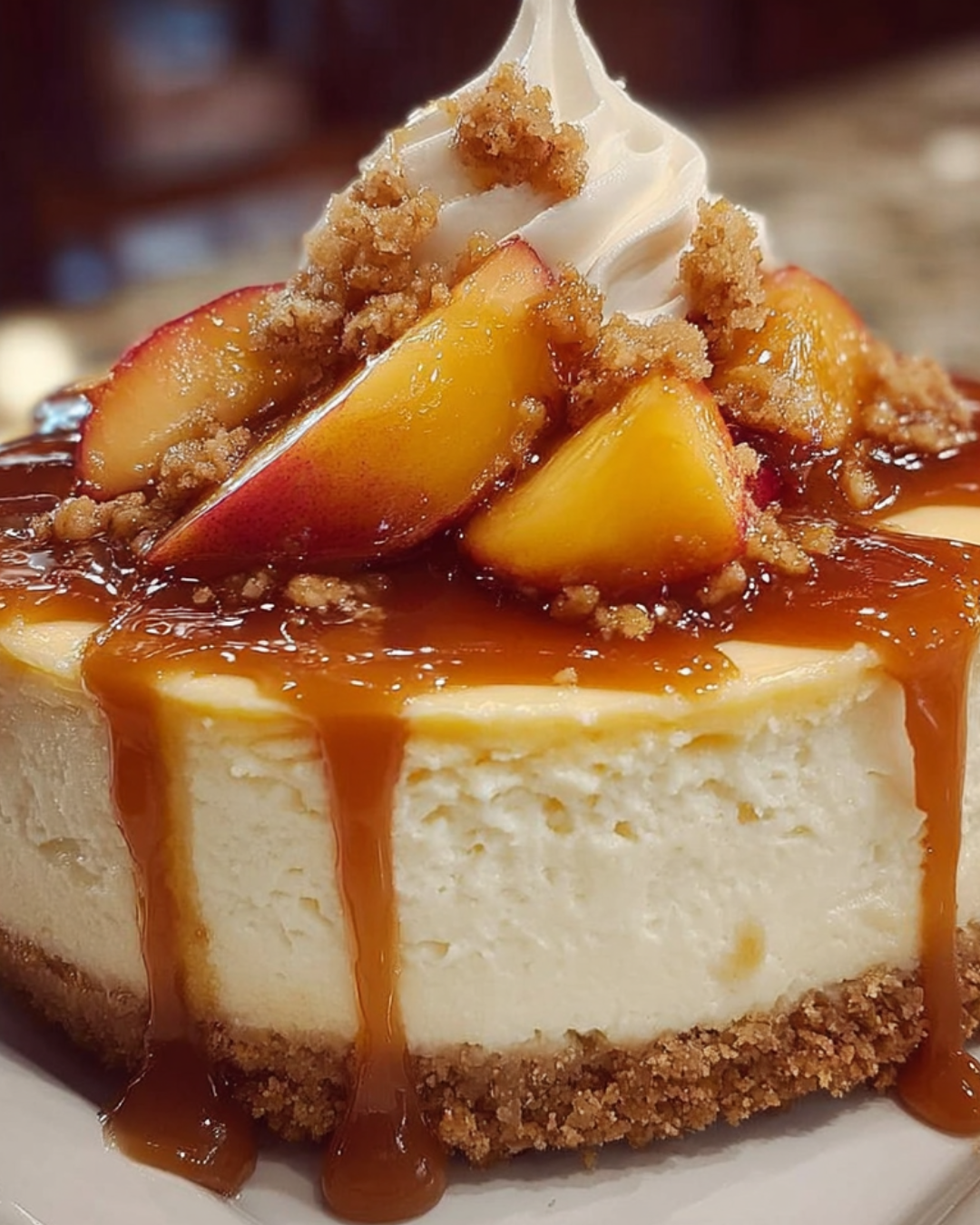 Vanilla Bean Cheesecake with Peach Cobbler & Salted Caramel